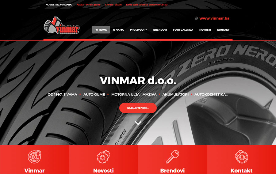 Novosti iz Vinmara Pirelli ljeto 2022 Administrator 2. ožujka 2022. Na linku ispod imate cjenik Pirelli guma za ljeto 2022. Dodatne informacije možete dobiti Opširnije… Novo u ponudi – akumulatori !!! Administrator 25. studenoga 2020. Našu bogatu ponudu smo upotpunili akumulatorima AKOM, REACTOR i VP-POWER. Garancija proizvoda do 43 Opširnije… Pirelli zima 2019 Administrator 24. listopada 2019. Na linku ispod imate cjenik Pirelli guma za zimu 2019. Dodatne informacije možete dobiti Opširnije… Protekt gume Administrator 10. kolovoza 2018. Novo u ponudi – Protekt gume za teže uvijete rada. Dodatne informacije možete dobiti Opširnije… Nove web stranice www.vinmar.ba Administrator 12. kolovoza 2017. Dobrodošli na naše nove web stranice www.vinmar.ba. Ovdje se možete upoznati s osnovnim informacijama Opširnije…